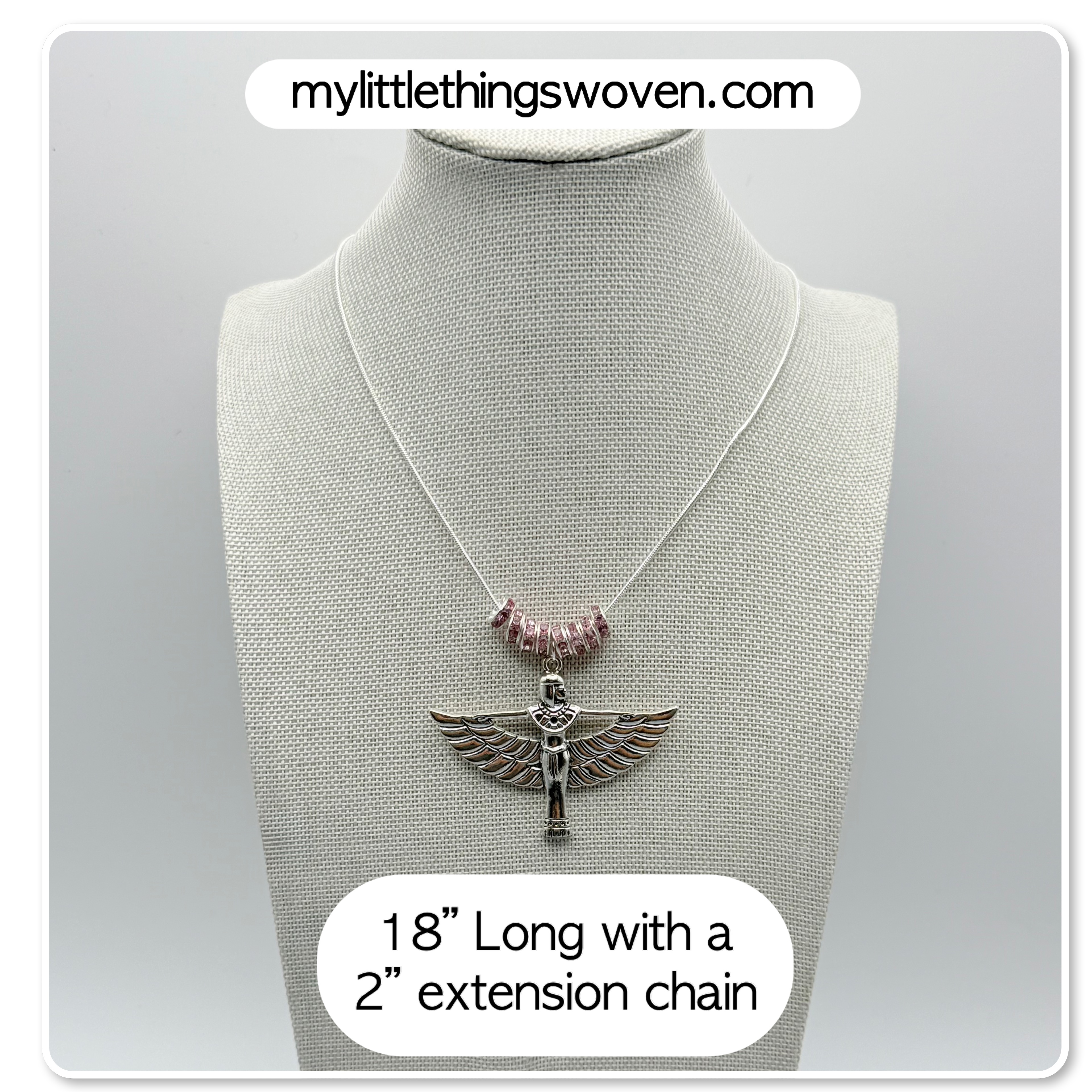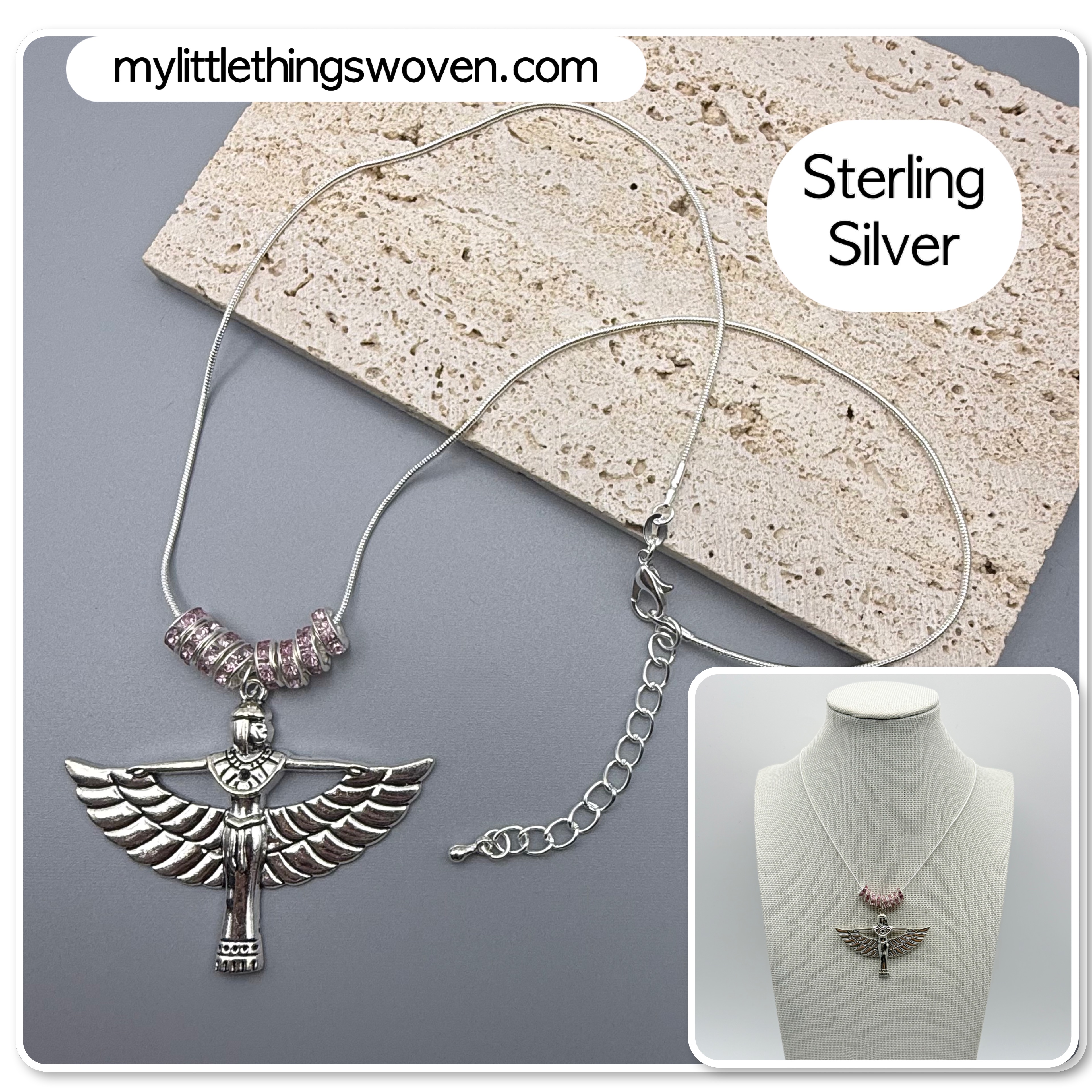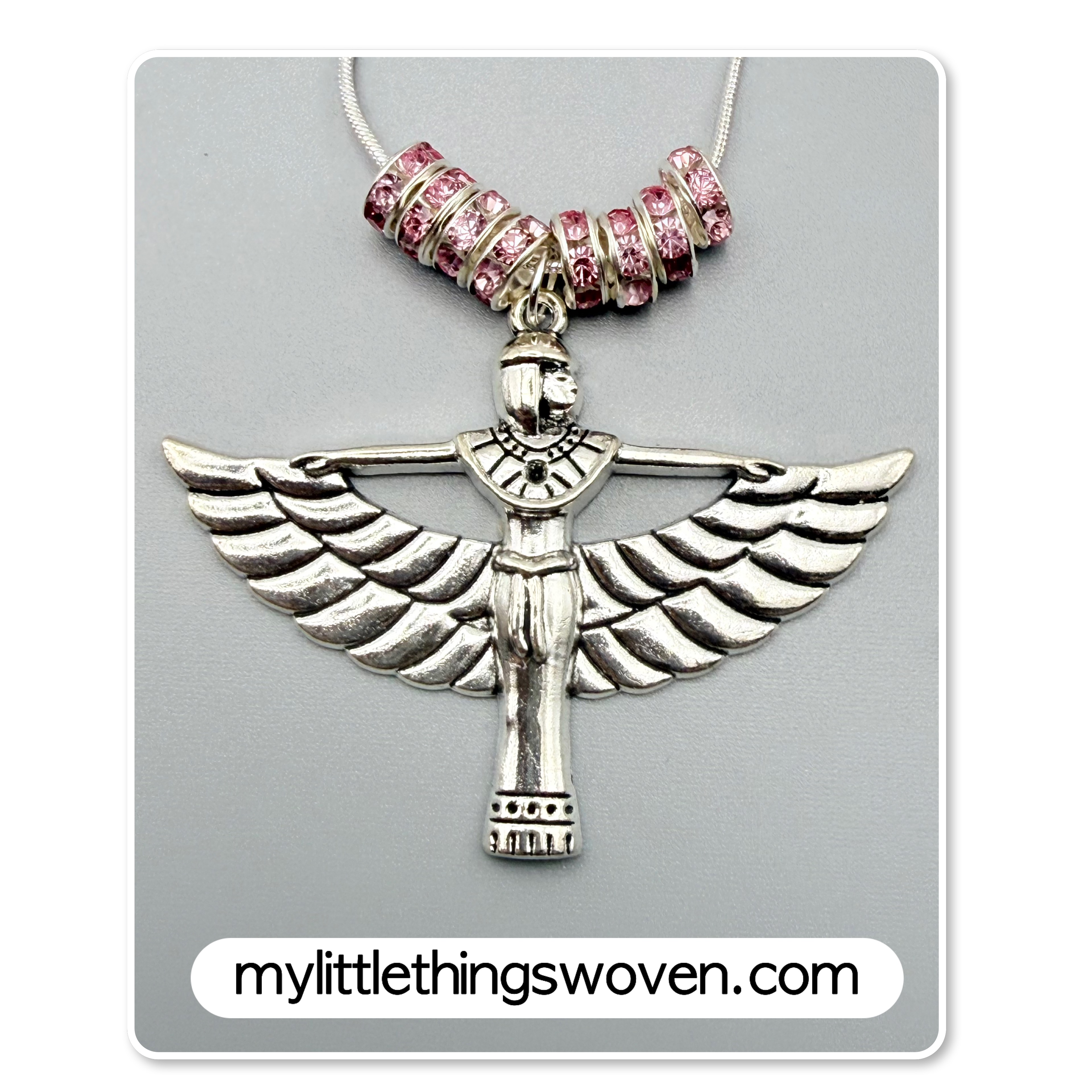 Winged Isis Goddess Amulet Pendant/Necklace with Pink Rondelle Beading, Sterling Silver