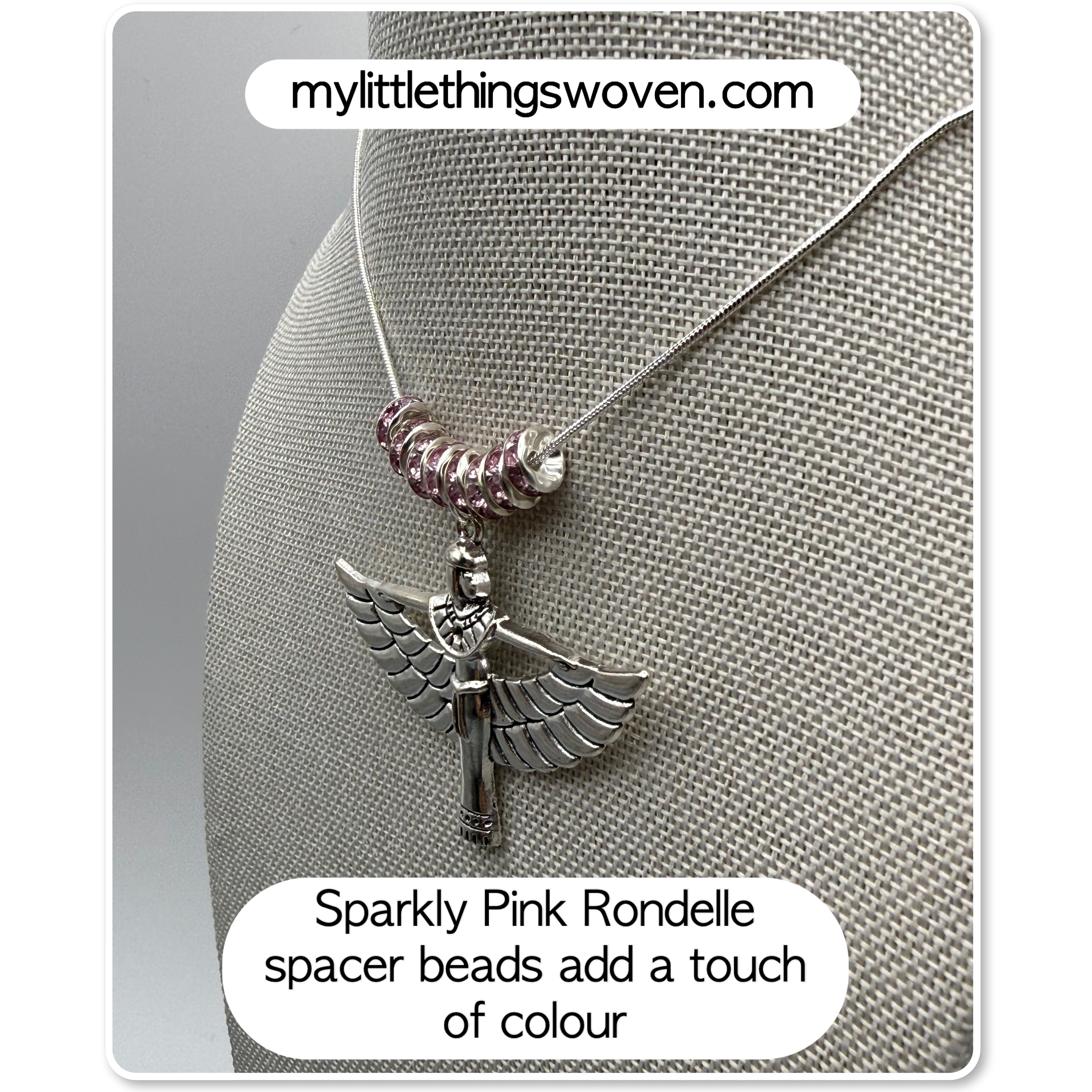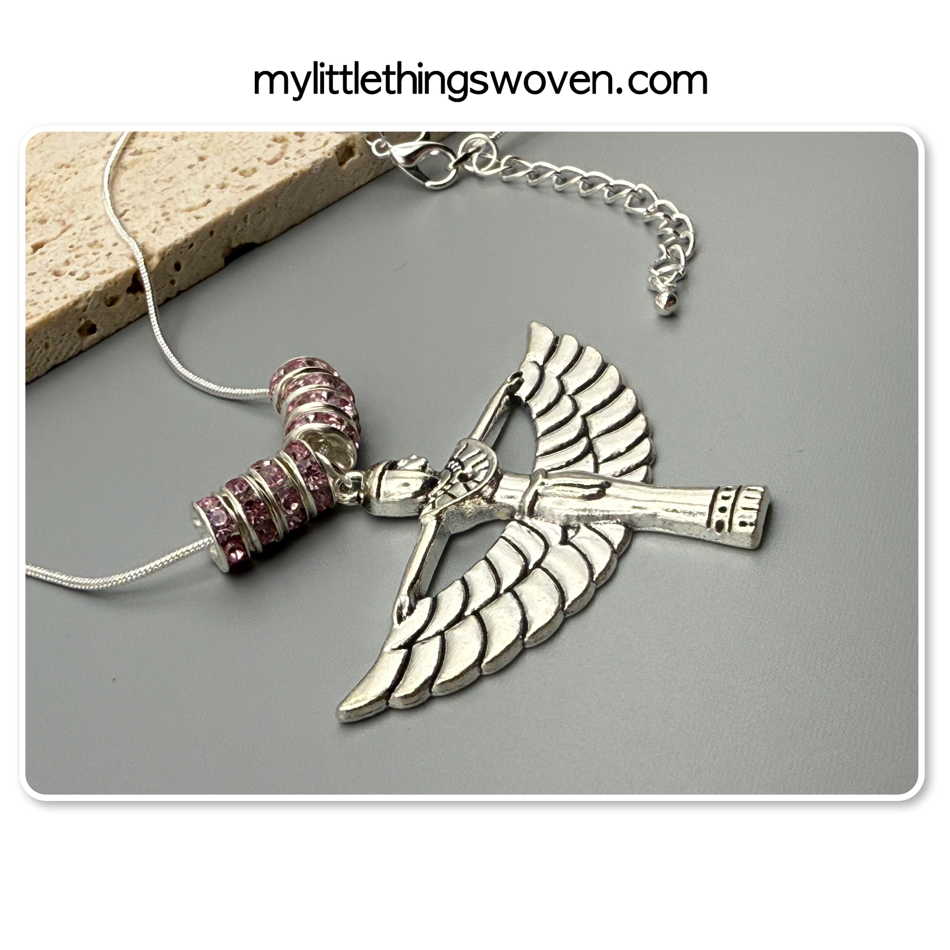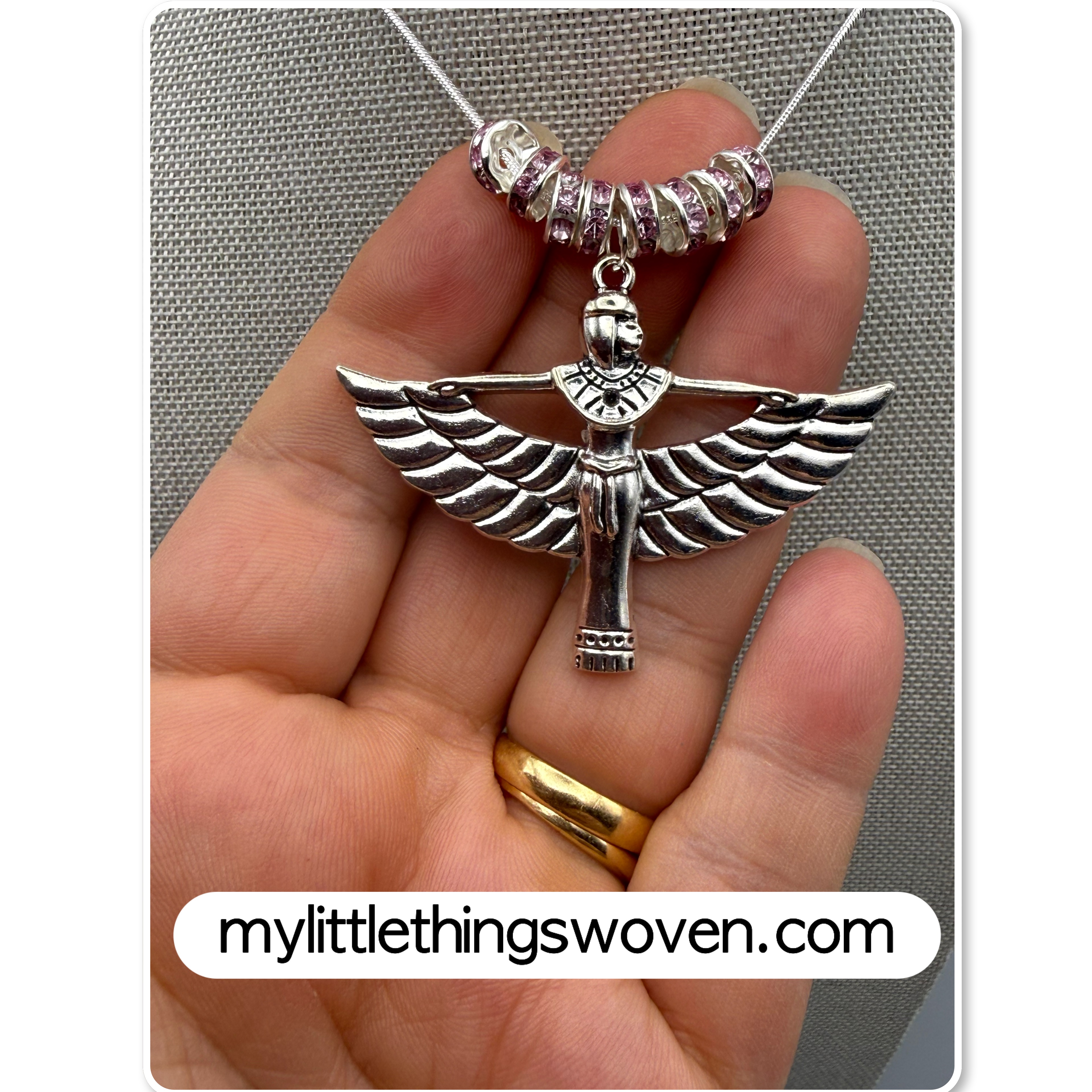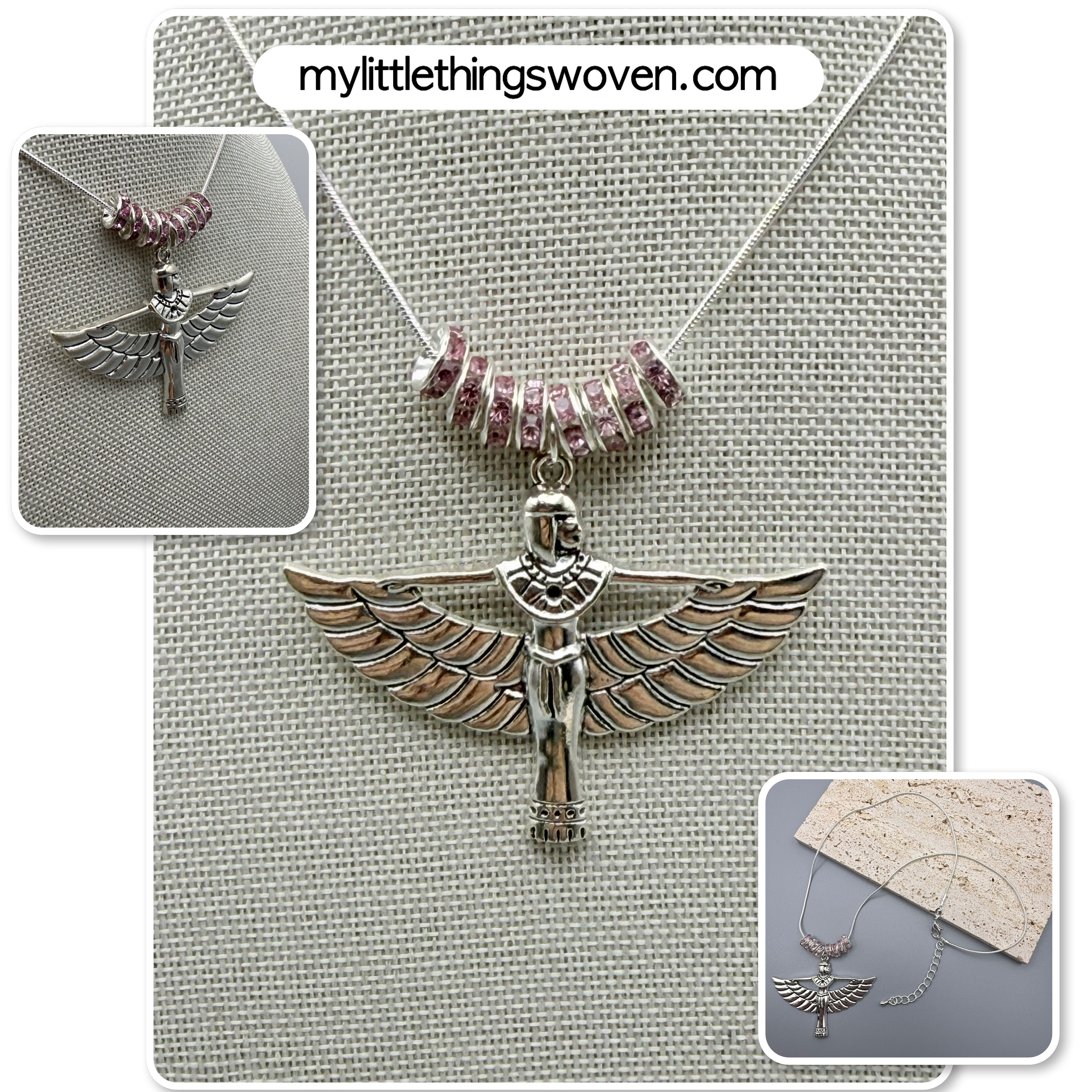 Winged Isis Goddess Amulet Pendant/Necklace with Pink Rondelle Beading, Sterling Silver
