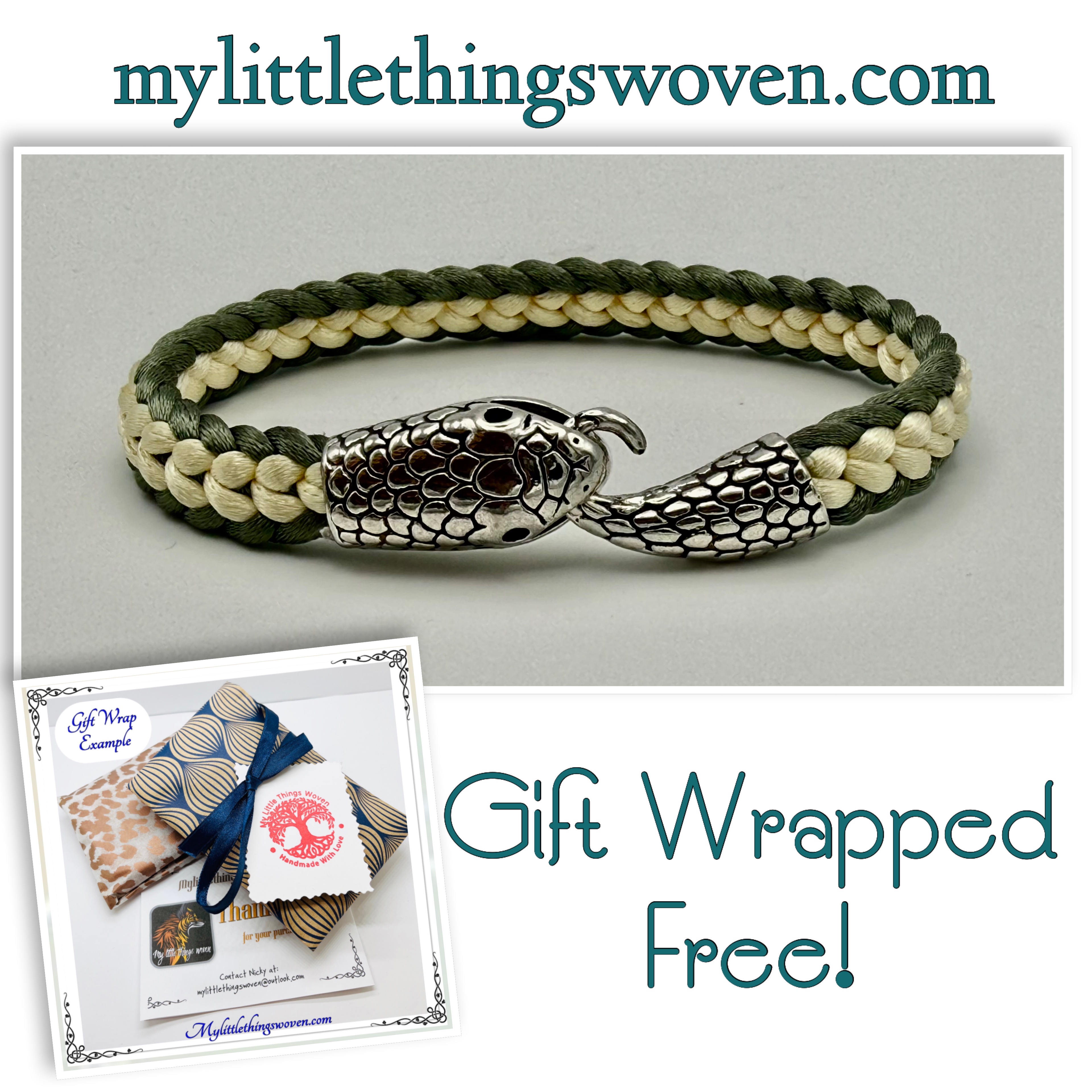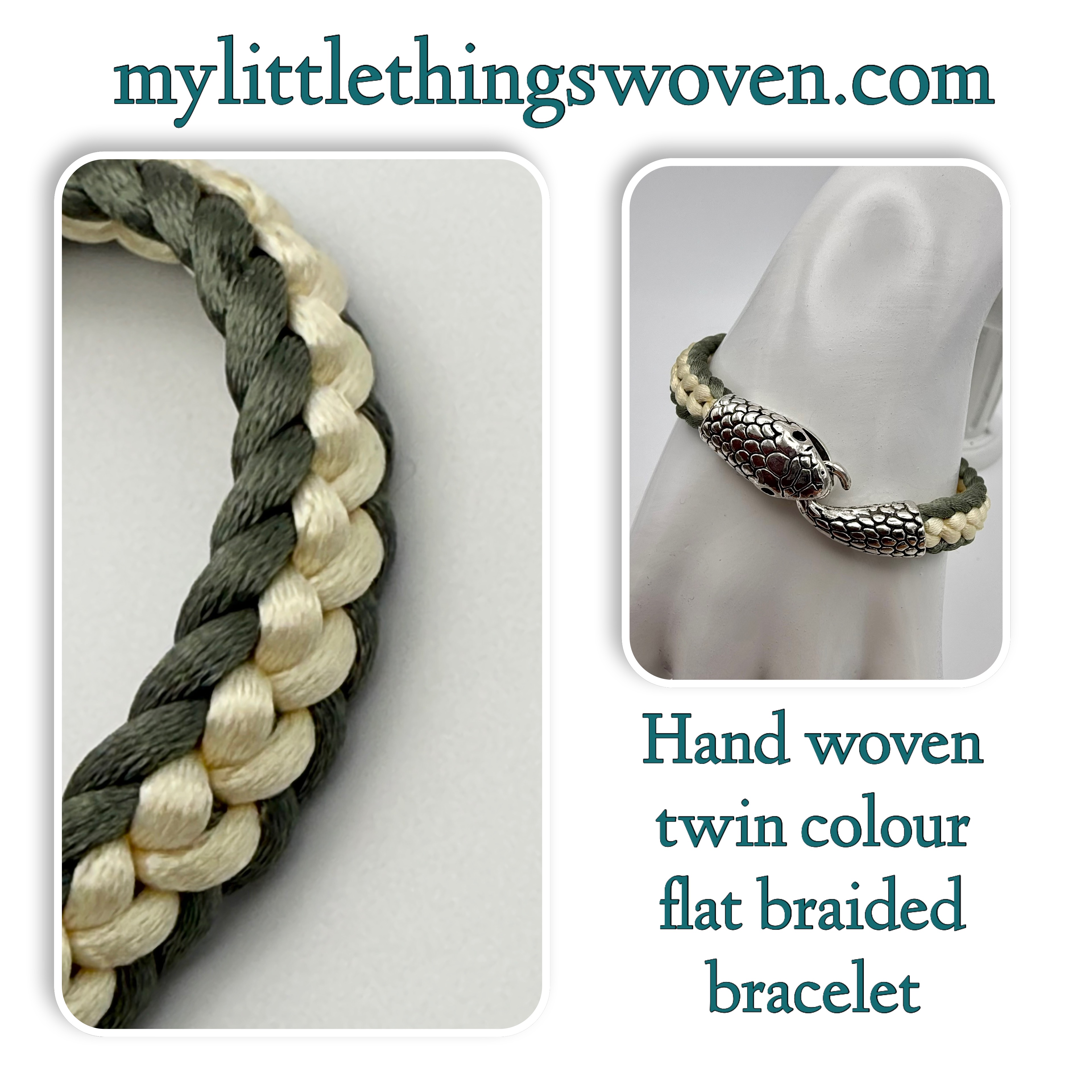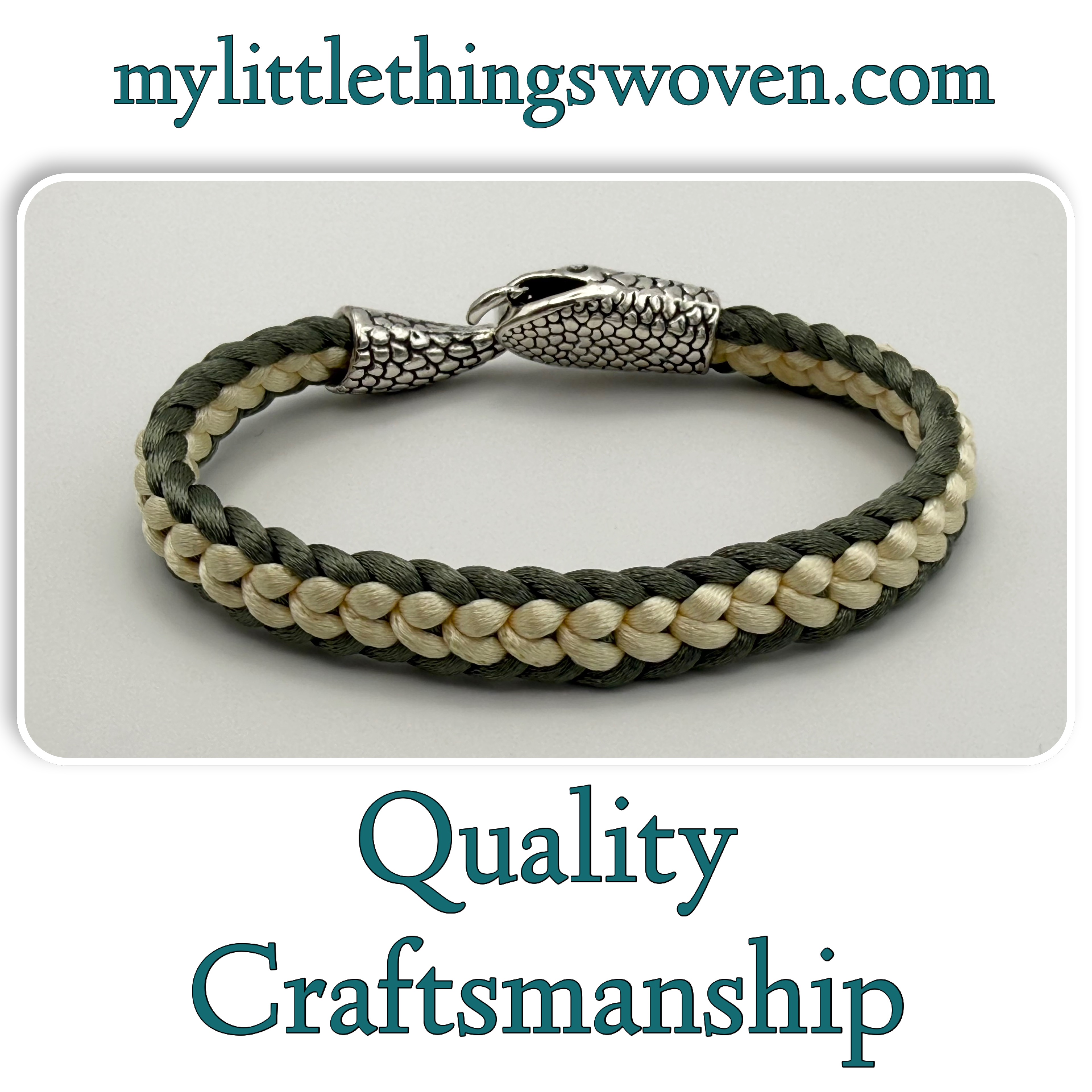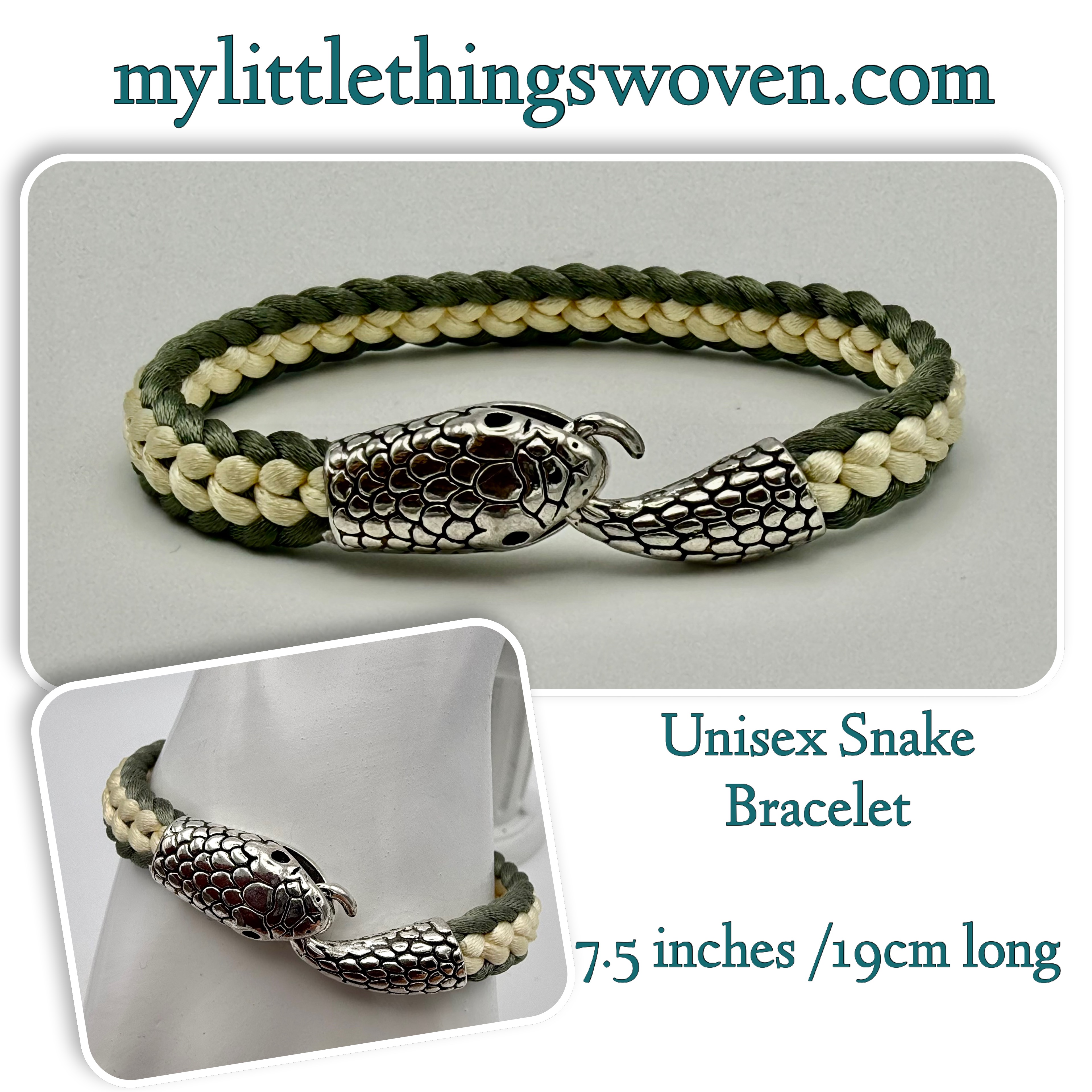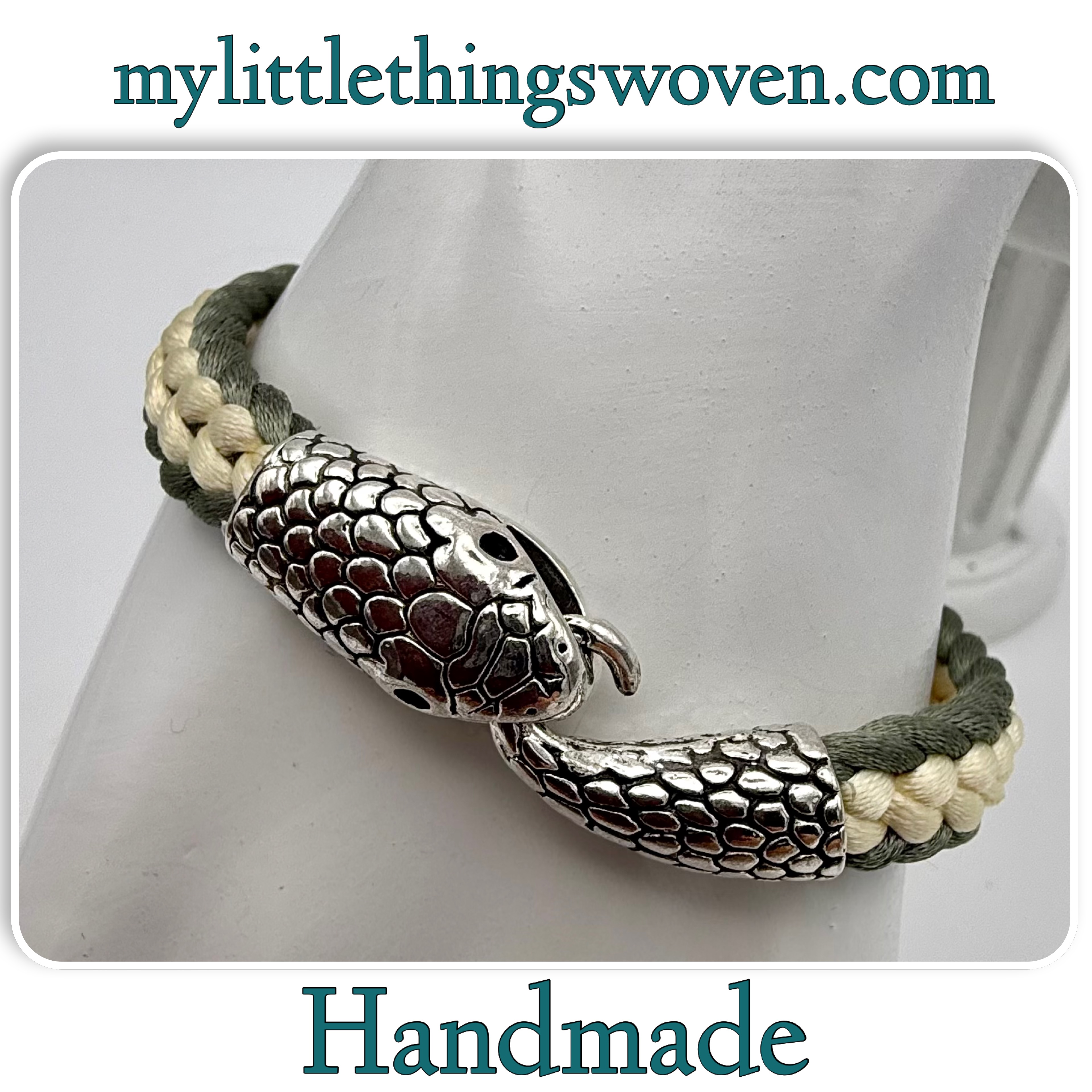 A unique hand-woven bracelet featuring a green and cream two-toned flat braided cord with a silver-engraved snakes head and tail clasp.