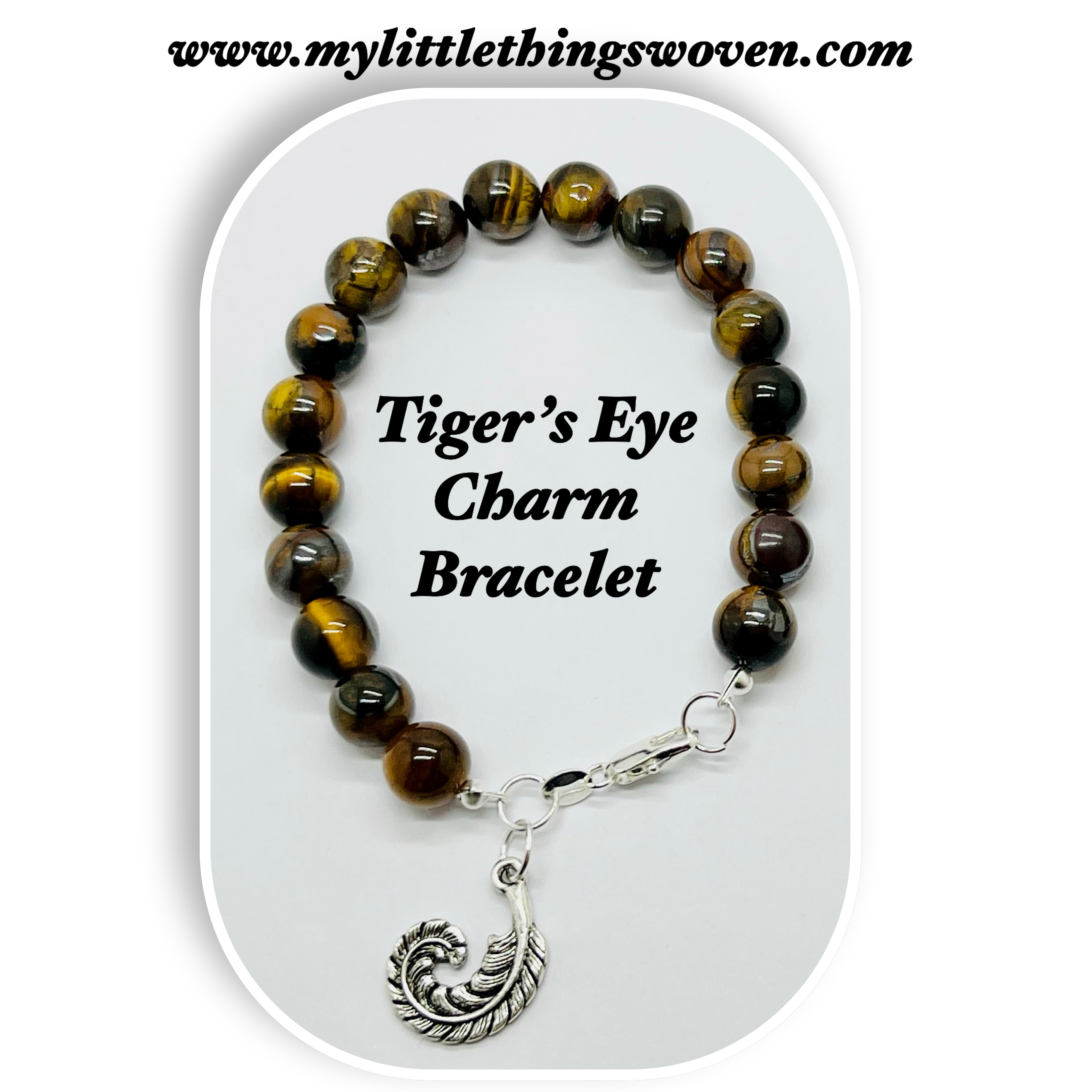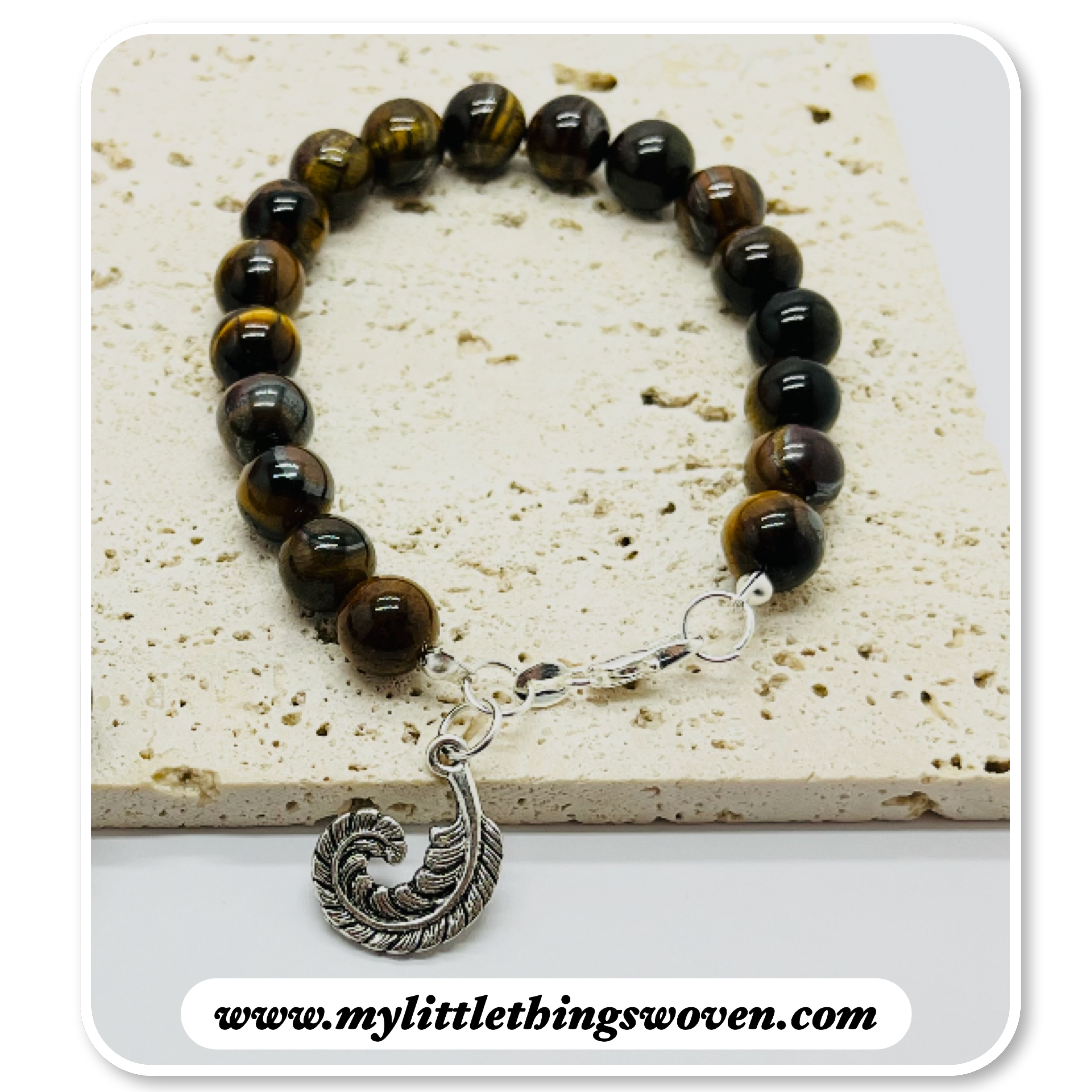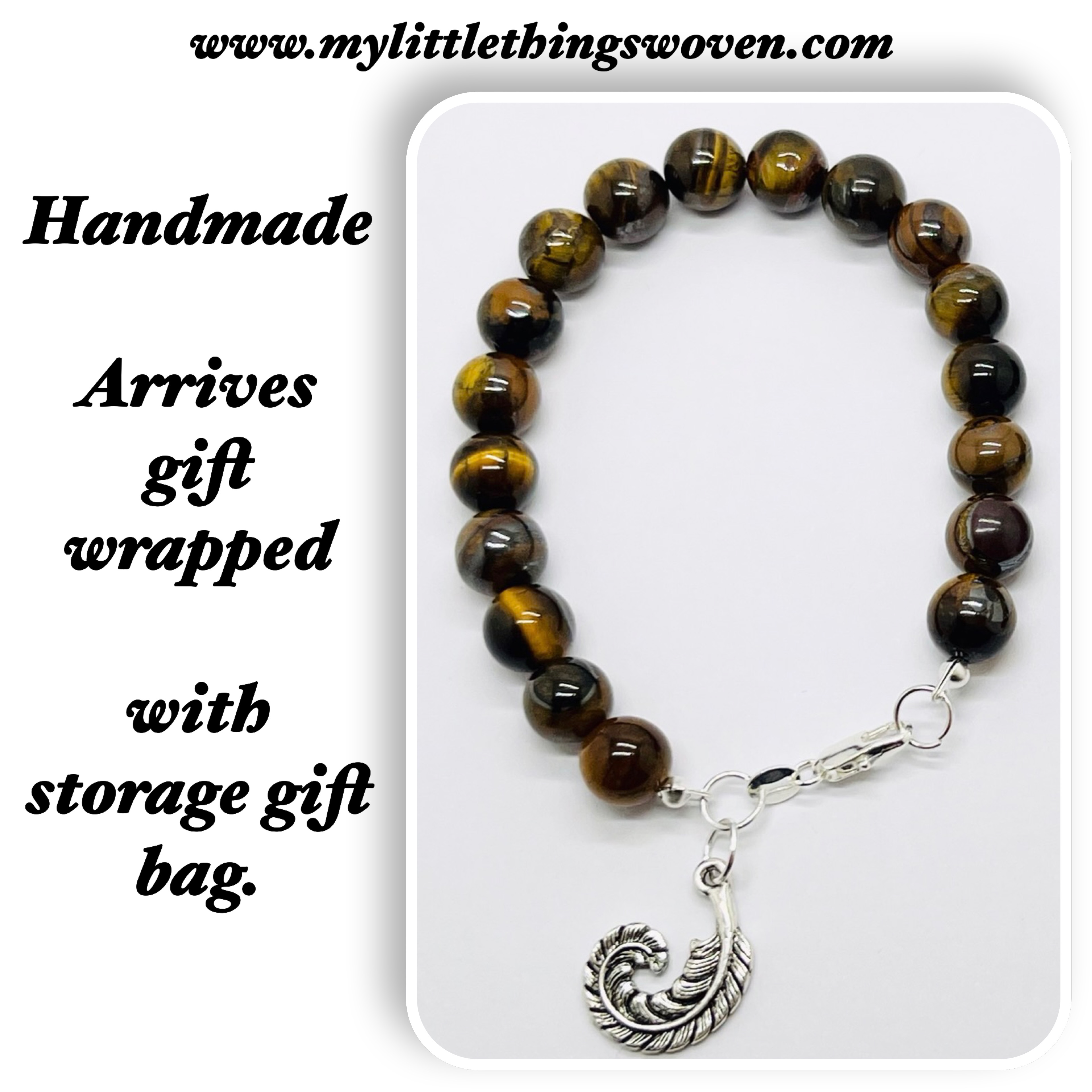 Tigers' Eye real stone semi precious gemstone bracelets with quill feather charm.