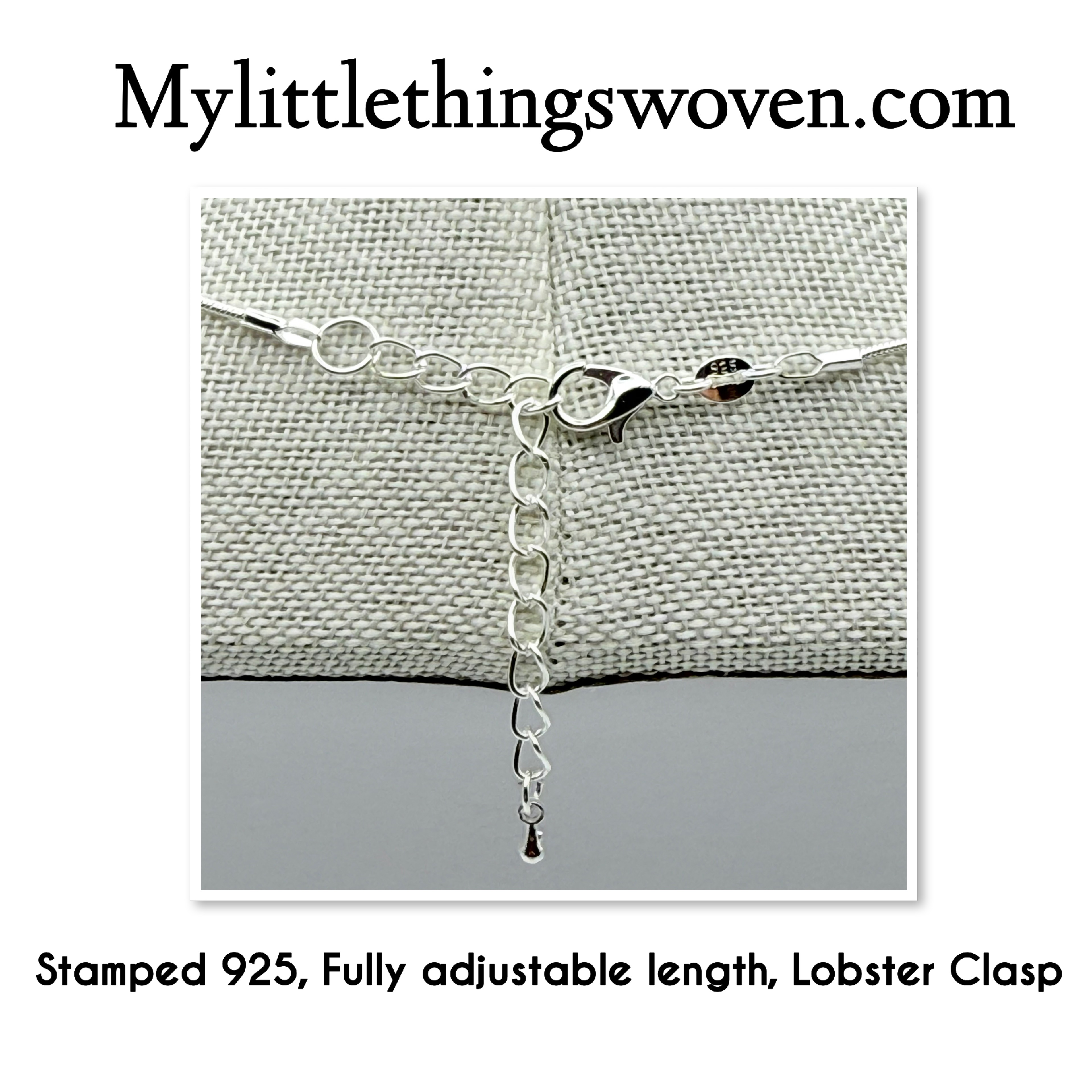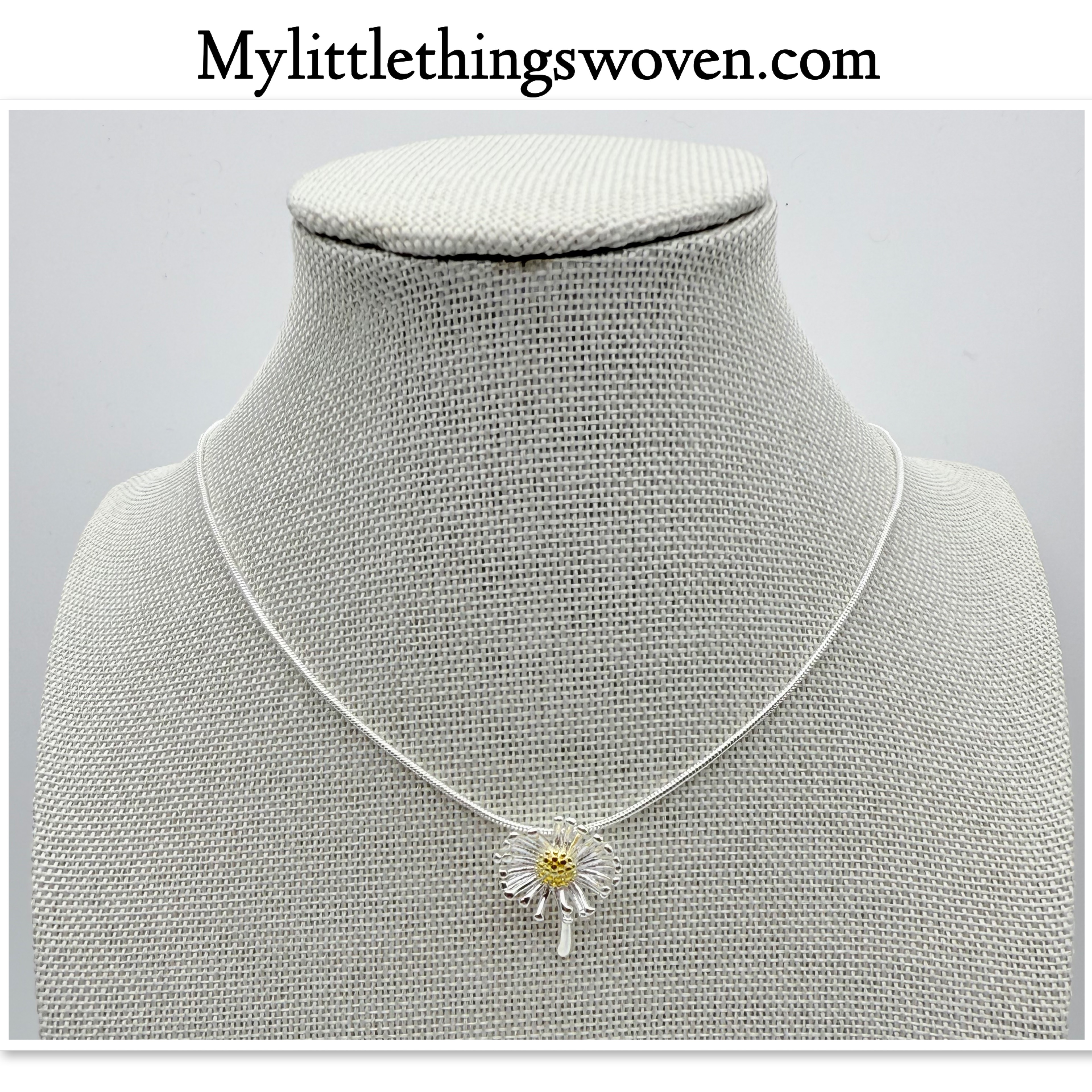 A meticulously crafted sterling silver daisy pendant is suspended from an 18-inch sterling silver “Snake” chain, complemented by a 2-inch extension chain.