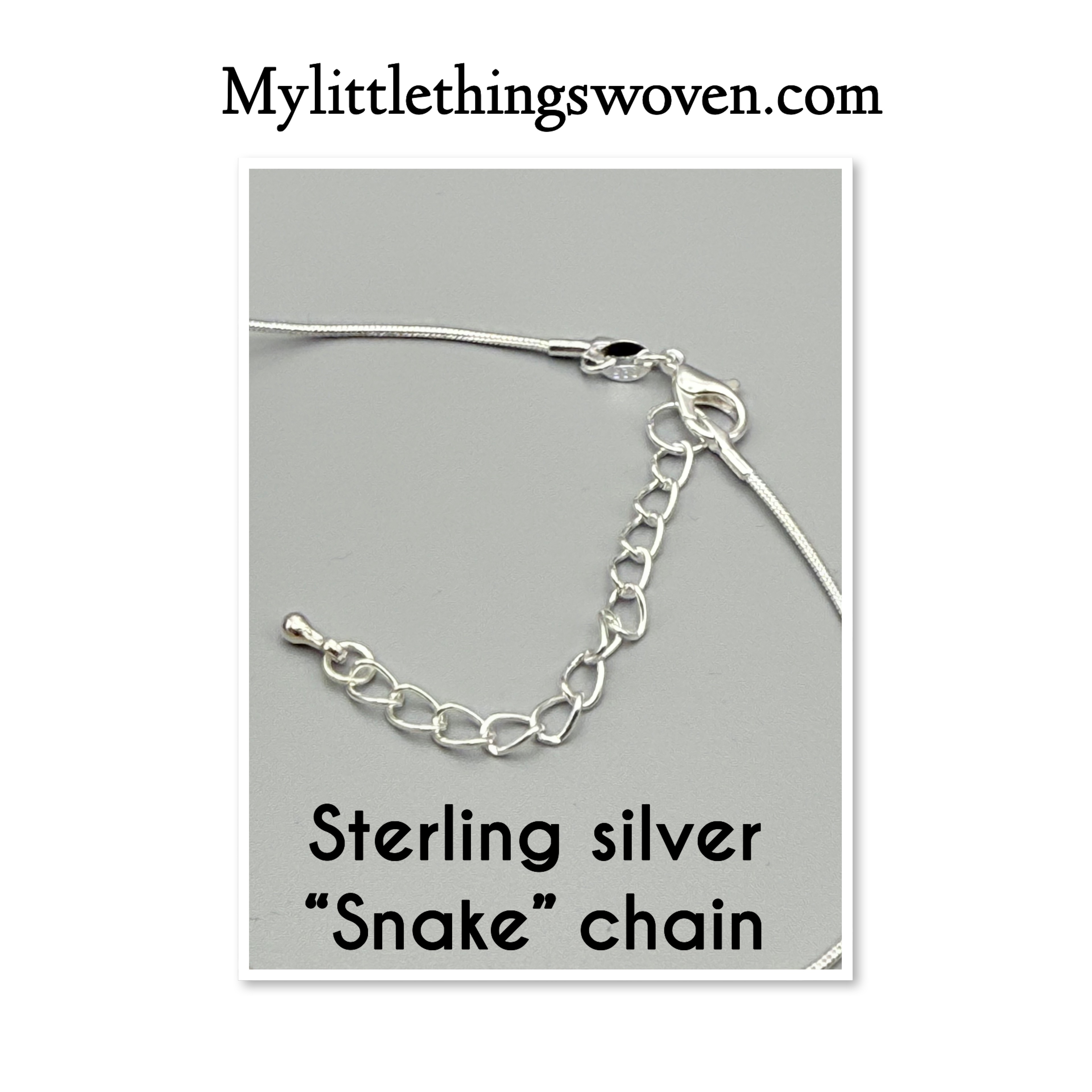The pendants are complemented by the “snake” chain, which is fully adjustable in length and secured with a lobster clasp.