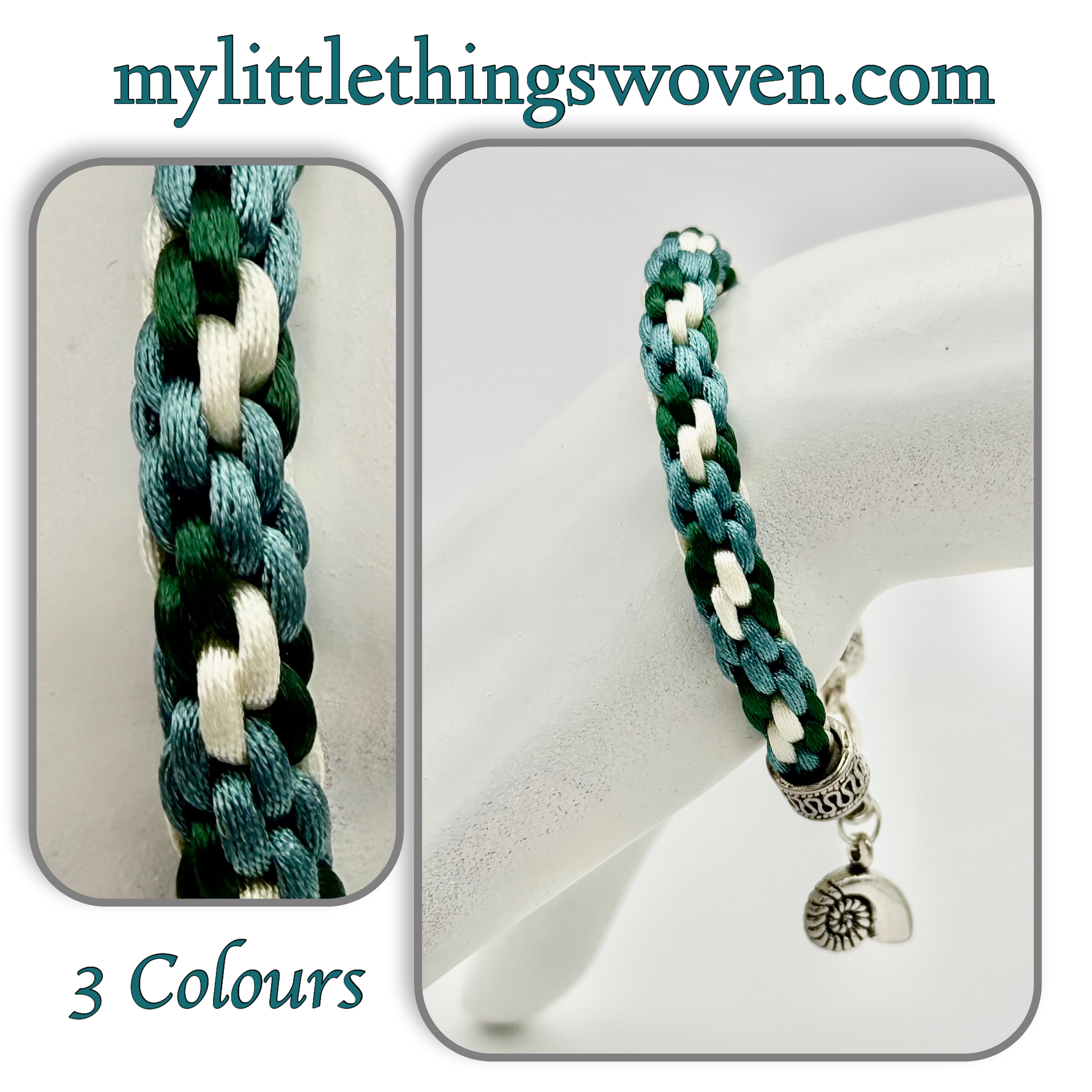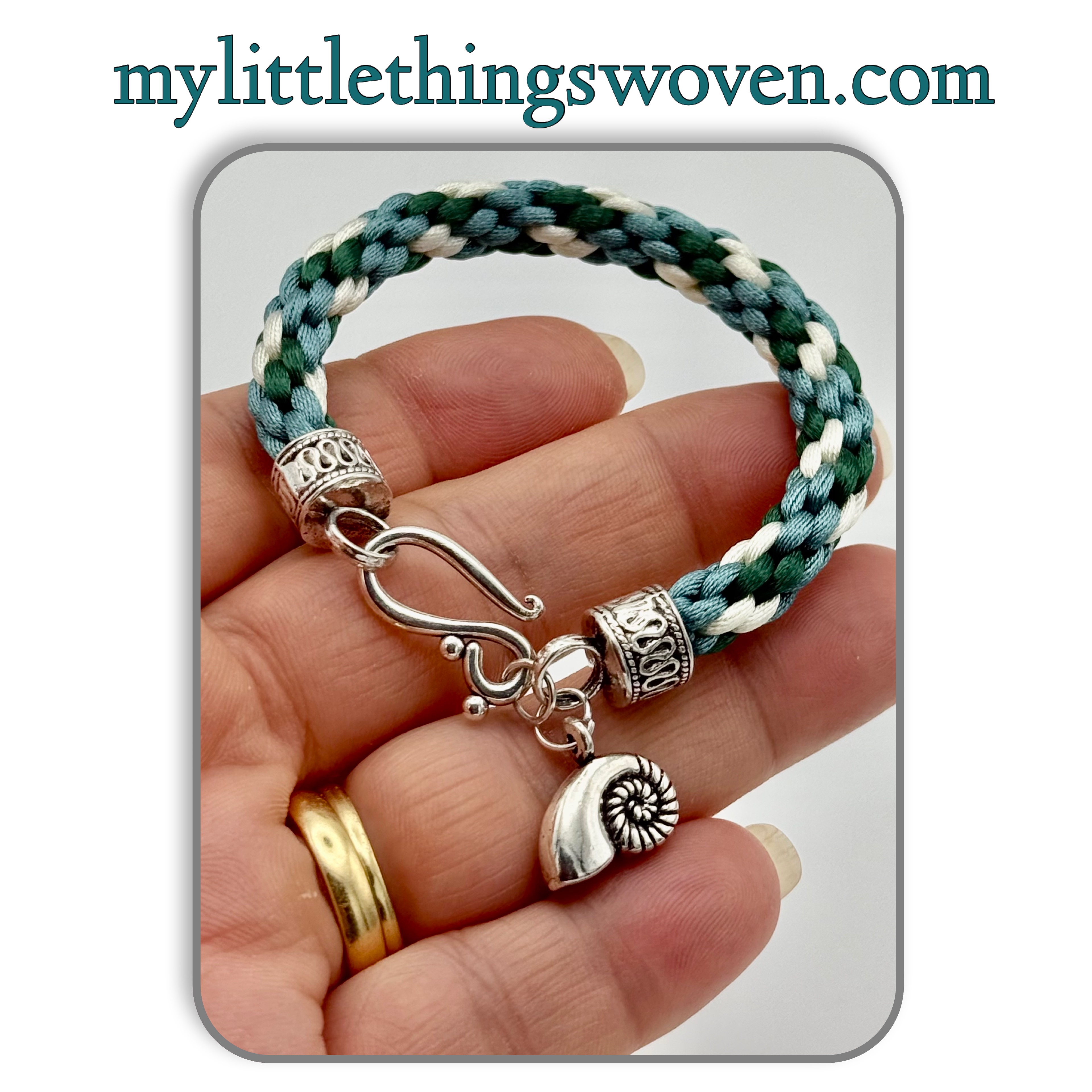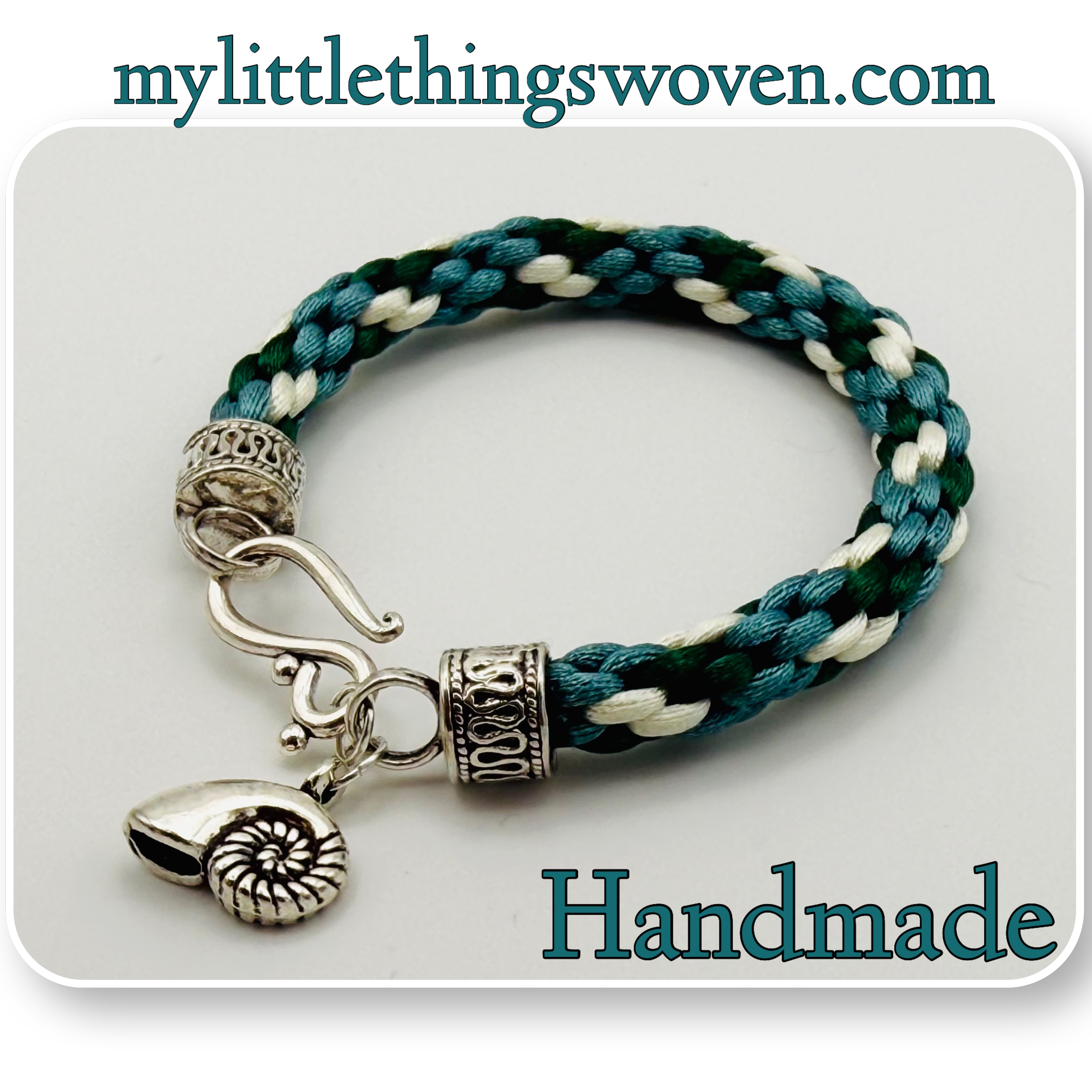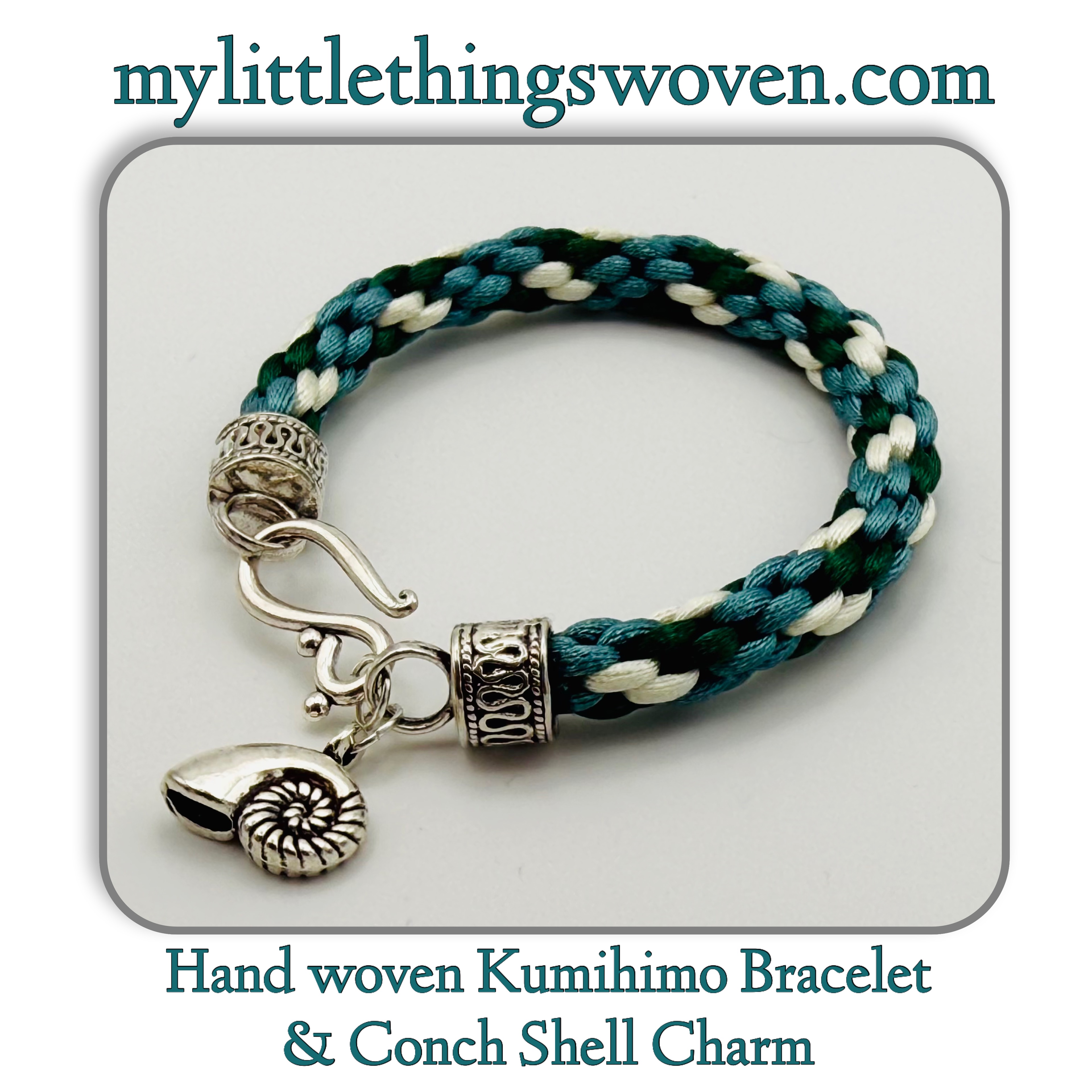 Teal Multicoloured Kumihimo Braided Bracelet with Silver Conch Shell Dangle Charm