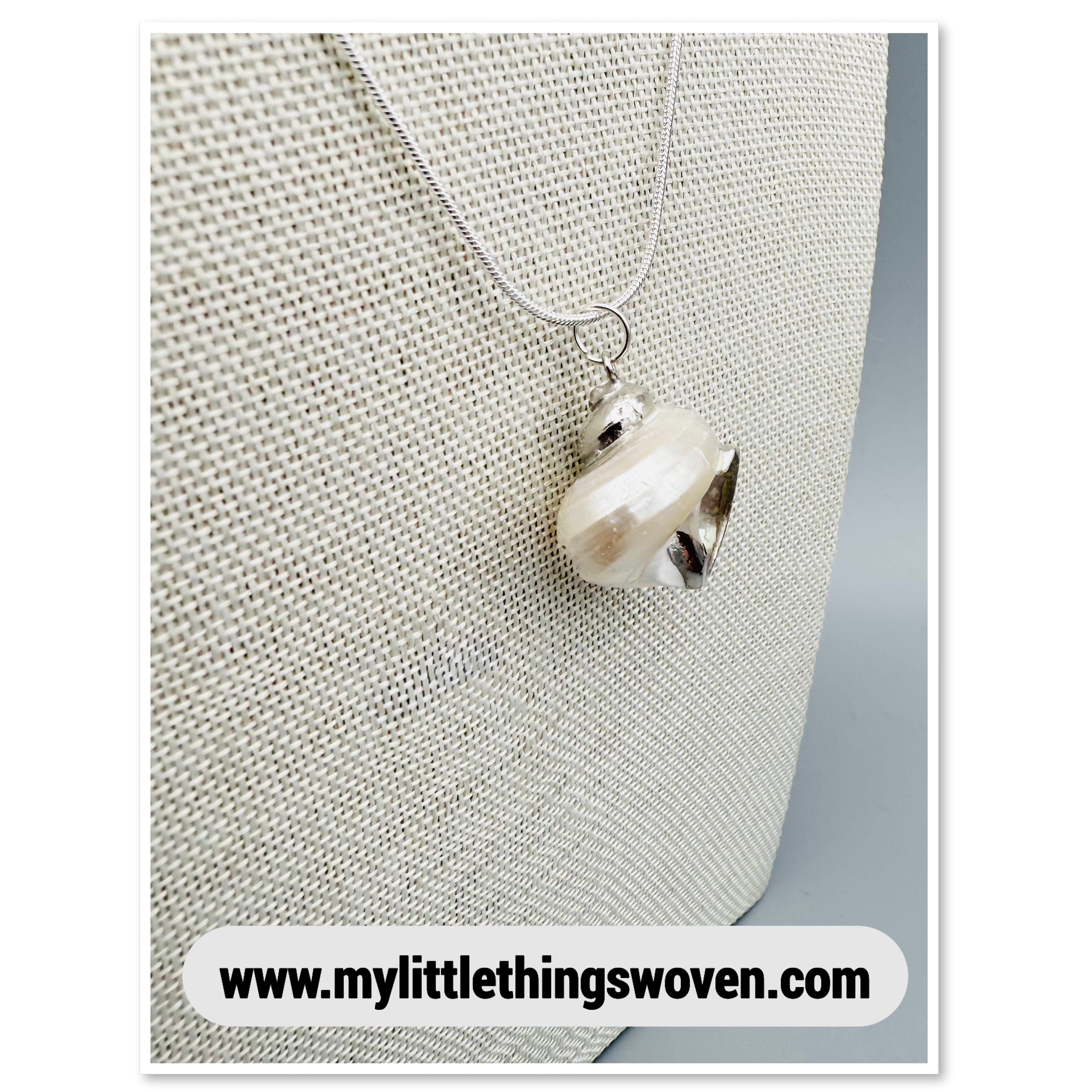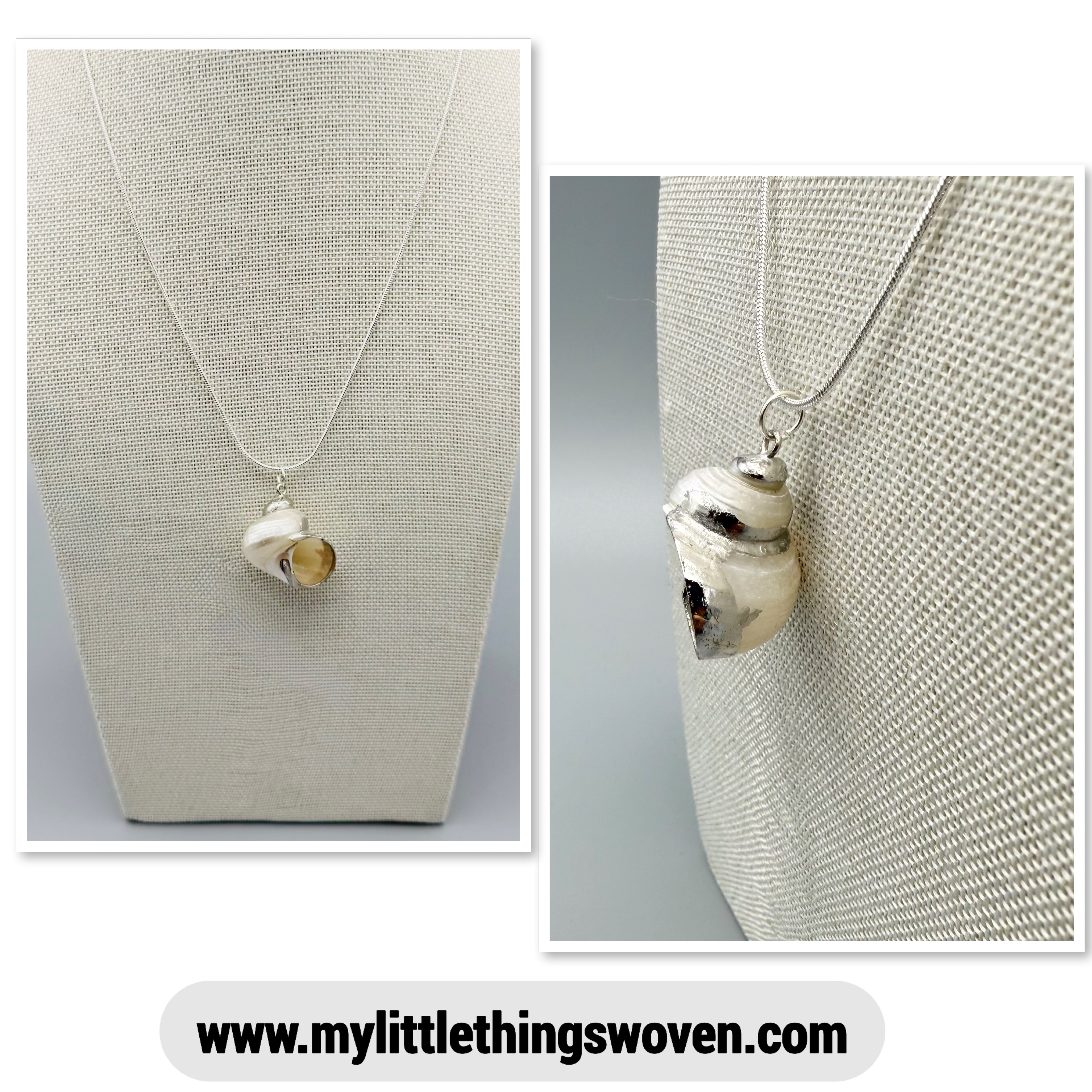What makes this pendant extra special is its fascinating origin - this beautiful hermit crab shell has been carefully transformed into an elegant piece of wearable art. The silver plating around the edges not only adds a sophisticated metallic accent but also provides essential structural support, ensuring your pendant will maintain its beauty for years to come.